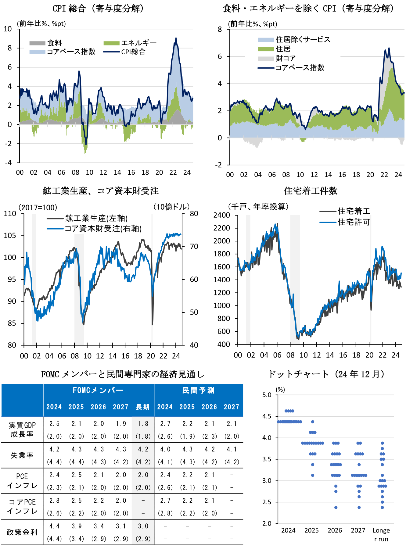 - 12月FOMCでは利下げが事前予想通りに決定されたものの、4人の参加者は据え置きが適切との見解を示した。また、同時に公表された四半期経済見通しでは2025年におけるインフレ率予想が引き上げられ、利下げ回数見通しも2回へと減少するなど、緩やかな利下げペースが示された。