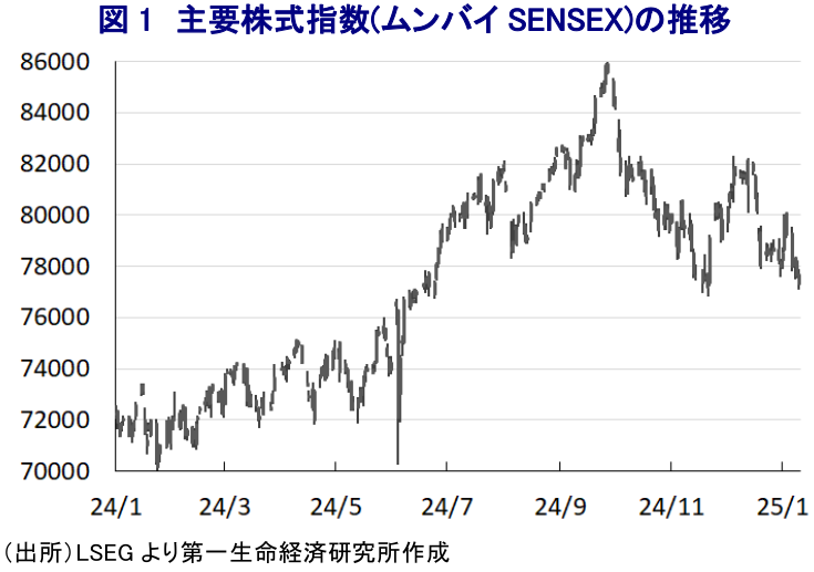 このところの国際金融市場を巡っては、昨年11月の米大統領選においてトランプ氏が勝利したことを受けて、同氏の主張する政策に加え、関税を『ディール(取引)』の材料に駆使する手法を理由に米国のインフレが高止まりするとの見方が強まっている。こうしたことから、米FRB(連邦準備制度理事会)は昨年後半にインフレ鈍化を理由に利下げに動いたものの、先行きについては利下げペースの鈍化、ないし利下げが困難になるとの見方が強まり、米ドルの動きが再燃している。さらに、米トランプ次期政権が関税の再強化に動くとの思惑は、米中摩擦のさらなる激化を招くとともに、底入れが期待された世界貿易を再び萎縮させるとの見方に繋がり、世界経済の足かせとなる懸念が高まっている。こうした動きは、経済構造面で相対的に輸出依存度が高い新興国にとって景気の足かせとなることが懸念されており、株式も下振れするなど資金流出圧力に晒されている(注1)。他方、経済構造面で外需依存度が相対的に低いインドについては、こうした悪影響を受けにくいと見込まれるものの、足下のインド金融市場は海外への資金流出圧力に晒されるなど難しい状況に直面している。インド株を巡っては、ここ数年は経済の成長期待を追い風に上昇してきたほか、昨年の総選挙では与党BJP(インド人民党)は議席を減らすもモディ政権は無事3期目入りを果たし、その後も上値を追う動きをみせてきた。しかし、昨年9月末を境に上昇基調が続いた流れは一変するとともに、足下においても下値を探る展開をみせるなど状況は大きく転換している。その背景には、中国当局が政策転換により景気下支えに動く姿勢をみせたことで低迷した中国本土株が大きく底入れし、折しもインド株の割高感が意識されたことも重なり、外国人投資家の間に投資対象となる新興国株の組み換えが行われたとみられる(注2)。さらに、一昨年のインド株を揺さぶったいわゆる『アダニ問題』を巡って新たな疑惑が噴出しており(注3)、インド株を取り巻く状況が厳しさを増すなかで外国人投資家の間でインド企業に対する評価が悪化することが懸念された。また、一昨年は雨季(モンスーン)の雨量が下振れしたことに伴う農業生産の低迷を受けた食料インフレに直面し、中銀(準備銀行)は引き締め姿勢を維持せざるを得なかったものの、昨年はそうした影響が一巡したほか、雨季の雨量も例年を上回ったことで物価は落ち着きを取り戻すことが期待された。しかし、現実には足下のインフレは中銀が定めるインフレ目標の中央値(4%)を上回る推移が続いている上、異常気象の頻発を理由に生鮮品や穀物などの食料品価格は高止まり、ないし上昇が続くなどインフレ圧力がくすぶる状況にある。そして、国際金融市場での米ドル再燃を受けて足下のルピー相場は調整の動きを強めて最安値を更新しており、輸入物価を通じたインフレ増幅が懸念されるなか、中銀は通貨防衛を目的とする為替介入を断続的に実施しているとみられる。他方、昨年7-9月の実質GDP成長率は前年比で+5.4%、前期比年率ベースでは+1%未満に留まり、物価高と金利高の共存長期化を受けて景気に急ブレーキが掛かる動きが確認されるなか(注4)、先月には中銀ダス前総裁が退任して後任に金融政策に対する見方が不透明なマルホトラ氏が就任し(注5)、中銀が利下げに動くとの観測が強まり長期金利は低下しており、ルピー安の動きに拍車が掛かる一因になっているとみられる。よって、足下のインド金融市場は通貨、株式、債券のすべてに売り圧力が掛かる『トリプル安』に直面していると捉えられる。足下の企業マインドを巡っては、製造業は頭打ちの動きをみせているものの、サービス業で堅調な動きがみられるなど、景気は底堅い動きをみせていると捉えられる。ただし、今月初めにインド政府が公表した今年度(2024-25年度)の経済成長率見通しでは、+6.4%と前年度(+8.2%)から鈍化して4年ぶりの伸びに留まるとともに、当初見通し(+6.5~7.0%)の下限をも下回るなど、製造業における生産低迷や企業部門による設備投資の弱さが景気の重石になるとの見方を示している。昨年までのインド株の上昇局面においては、インドが高い経済成長を実現するとの『期待』がその追い風となってきたことを勘案すれば、中長期的な観点でのインド市場への期待は依然高いと見込まれるものの、当面のインド市場を取り巻く環境は厳しい展開が続く可能性に留意する必要がある。