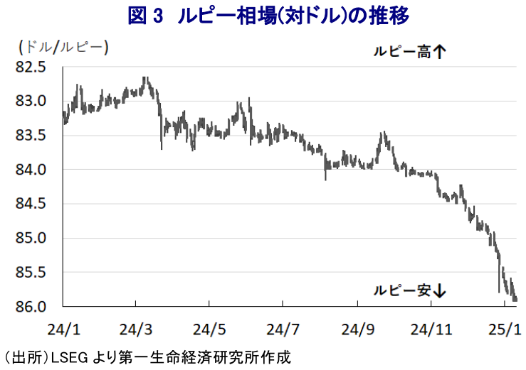 - このところの国際金融市場では、米トランプ次期政権による政策運営が米国のインフレを招くとの見方を反映して米ドル高が再燃している。さらに、関税再強化の動きが世界経済の足かせとなる懸念も重なり、新興国で資金流出圧力が強まる動きがみられる。インドは内需依存度が高いものの、昨年9月末以降の株価は頭打ちに転じる状況が続いている。さらに、インフレ懸念がくすぶるなかで米ドル安に伴うルピー安に晒されるなか、中銀は通貨防衛のための為替介入を迫られている。また、景気に急ブレーキが掛かるなか、中銀が利下げに動くとの観測を反映して長期金利も低下しており、インド金融市場は通貨、株式、債券のすべてに売り圧力が掛かる「トリプル安」に直面している。中長期的な観点では、インド経済や市場に対する魅力は依然高いと見込まれるものの、当面は厳しい環境が続く可能性に留意する必要があると捉えることができる。