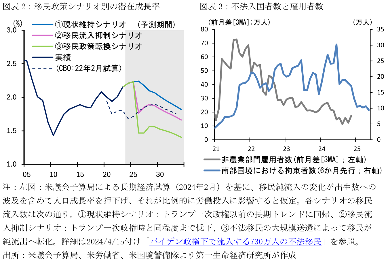 とはいえ、足下の米国経済の強さが不法移民による人口成長で押し上げられている可能性には留意が必要だ。不法移民の流入は2024年後半から減速しつつあるため、25年前半には雇用者数の増加ペースの減速感が強まるリスクがある。