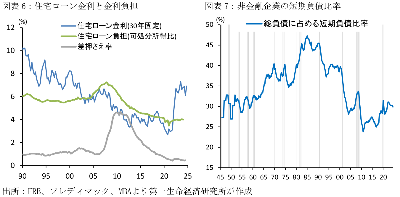 現状:FRBは2022年3月にゼロ金利から脱却するとともに利上げサイクルを開始し、23年7月には政策金利を5.25~5.50%まで急速に引き上げた。24年9月には利下げサイクルへと転じたものの、政策金利は依然4.25~4.50%と景気中立的な水準を上回っているとみられる。こうした高金利政策はいずれ景気後退を招くとの見方が強かったものの、現時点においてもそうした兆しはみられない。この理由として、米国の住宅ローンは9割が固定金利型で組まれており、利上げにも関わらず金利負担が抑制され消費を大幅に切り詰める必要がなかったことが指摘できる。一方、企業は長期固定型の資金調達を活用し、ITなどの無形資産へ継続的に投資支出する傾向にあり、従来の機械投資と比べると金利水準によって設備投資が変動する要素が弱まっている可能性がある。