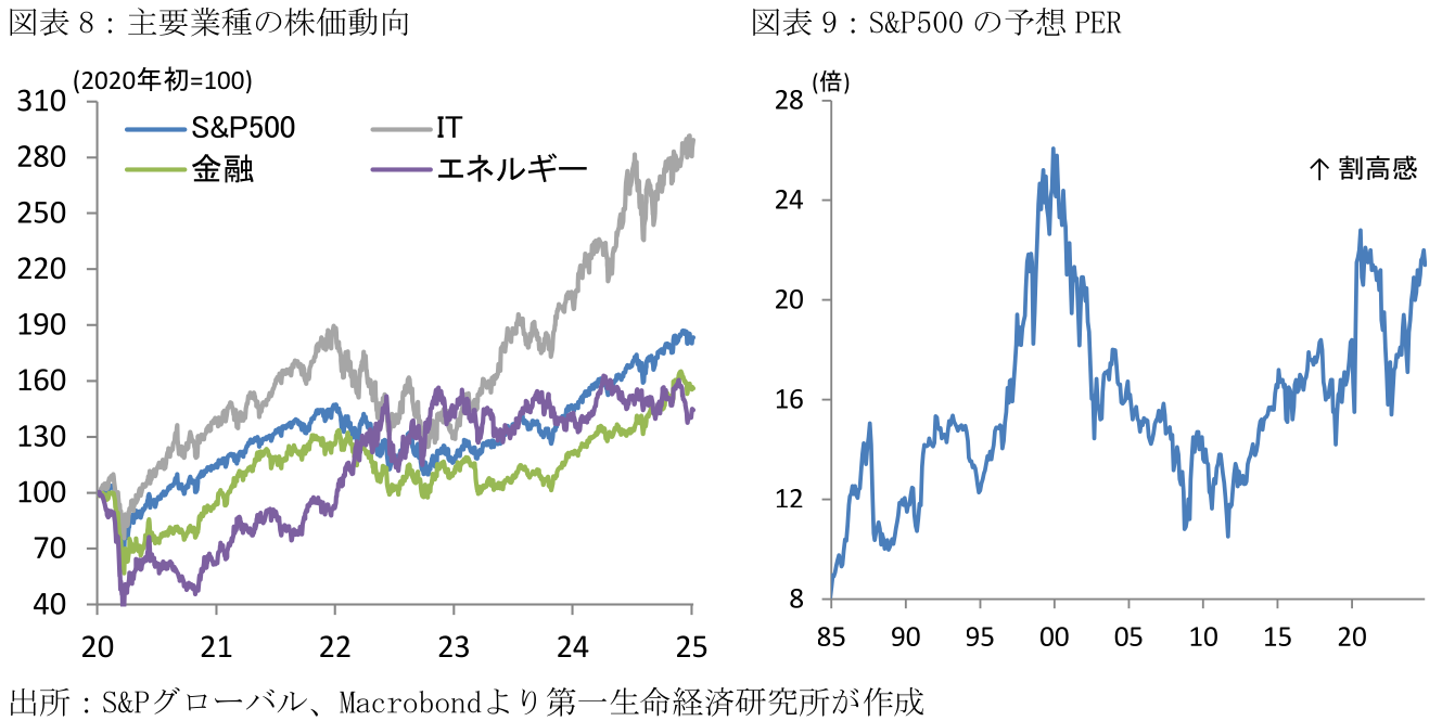 先行き:米国景気は2025年も堅調さを維持する見込みであり、仮に名目GDPが+4.5%の成長となる場合、株価(S&P500)は企業収益の拡大を背景に+10.4%上昇すると試算される。また、米国の市場関係者の61%は年末までの株価(S&P500)上昇を見込むなど、トランプ新大統領が選挙公約として掲げた家計向け減税や規制緩和への期待が株価への押し上げ要因になるとみている(注2)。とはいえ、株価の割高感を示す予想PERは24年末時点で21.4倍と、2000年以降の平均値である16.7倍を上回るなどやや過剰感が目立つほか、足下の株価は半導体関連や大型テック銘柄が牽引する構図が顕著である。後述の生成AI市場の成長期待に疑念が生じる場合、株価調整による逆資産効果が消費を下押しし、更なる企業収益の悪化懸念へと繋がるなど、株価動向が景気への増幅的な影響をもちうる点に留意が必要だろう。