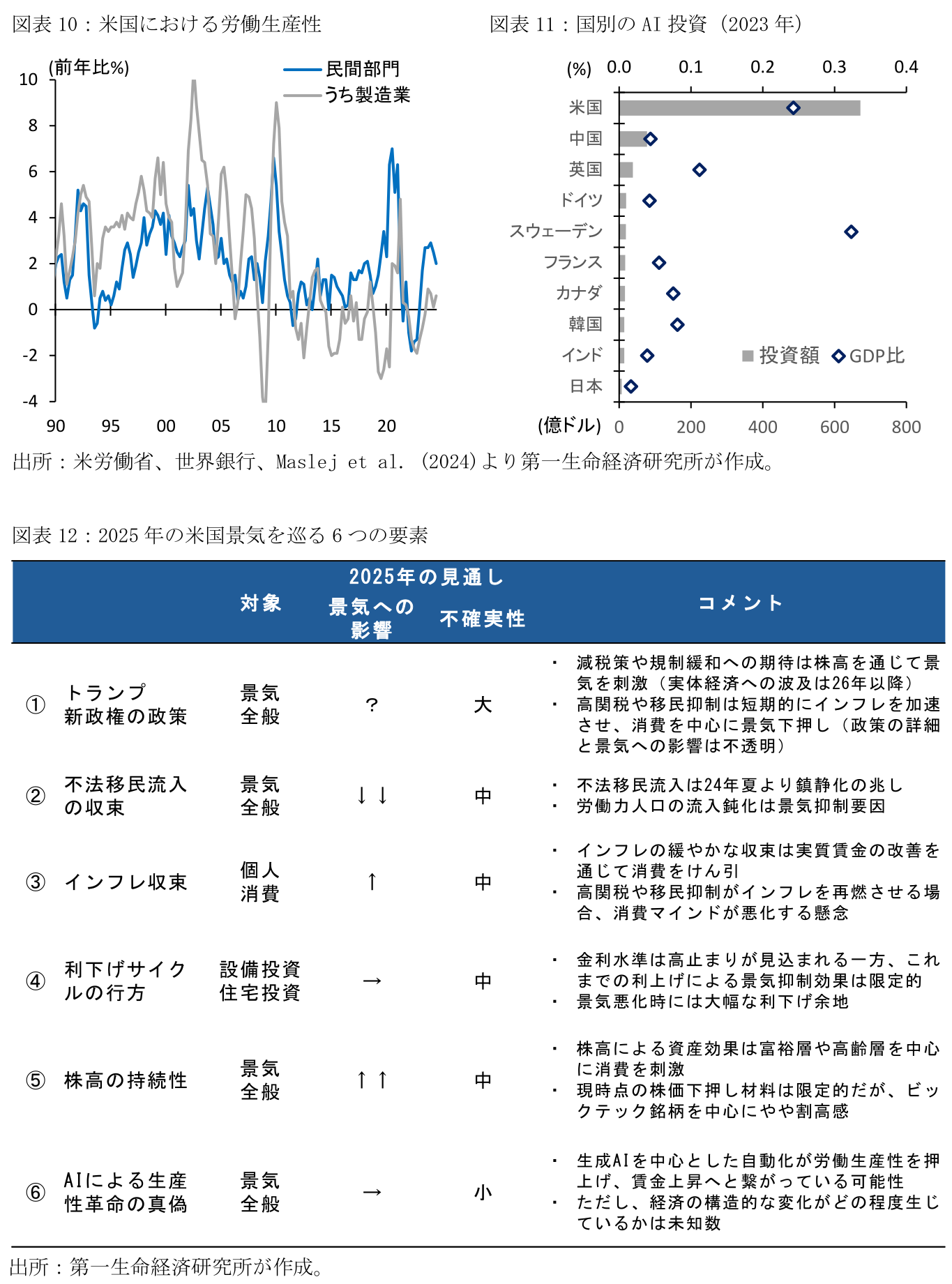 本稿では、近年の米国経済の想定以上の強さの背景、及び2025年の米国景気動向を占ううえで、以下の6つの要因に関して概観する。具体的には、2025年の新たな不確実性要因である「①トランプ新政権の政策」、これまでの景気押上げ要因から下押し要因に転じる可能性が高い「②不法移民流入の収束」が主要なリスクと考える。加えて、これまで同様「③インフレ収束」、「④利下げサイクルの行方」、「⑤株高の持続性」も焦点であろう。また、より構造的な中長期の成長を考えるうえでは「⑥生産性革命の真偽」も注目される。