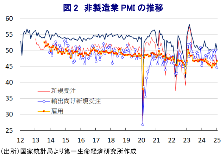 - ここ数年の中国景気は不動産不況に加え、若年層を中心とする雇用回復の遅れが内需の重石となるなかで外需への依存を強める展開が続いた。しかし、米トランプ政権は関税賦課を通じた圧力を強めるなか、昨年後半以降に当局は内需喚起による景気下支えに動いている。結果、昨年末にかけての景気は内需喚起の動きと米トランプ政権発足前の外需駆け込みの動きが景気底入れを促した。しかし、一連の内需喚起策は需要の先喰いに留まる可能性が高く、先行きはその息切れが景気の足かせとなる懸念はくすぶる。