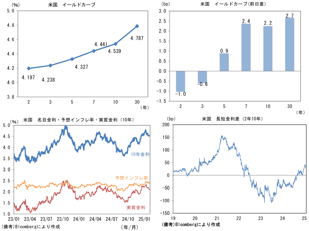 関税引き上げは、株式に対してマイナスの影響があることは本日の東京市場の寄り付き(日経平均株価は700円超安)を見れば明らかであるが、米長期金利や為替に与える影響は複雑になってくる。実際、関税引き上げが伝わった1月31日の米10年金利は、予想インフレ率が4.2bpの上昇となった反面、成長率に対する不安等から実質金利は▲1.8bpの低下となり、名目金利の上昇は2.2bpに留まった。また政策金利の見通しを反映する2年金利は▲1.0bpの低下となった。ここから判断しただけでも、「関税→インフレ率再加速→Fedが金融引き締め方向に傾斜」という波及経路が必ずしも市場参加者の共通認識ではないことがわかる。言うまでもなく、関税引き上げは米国の財物価のインフレ圧力を増幅させ得る一方、実質個人消費支出を下押しする他、企業の投資活動を抑制するなどして成長率の下押し要因となる。また既に一部で報じられているように報復関税が課せられれば、米企業の輸出に下押し圧力が増幅することで成長率は鈍化する公算が大きい。こうした複数の経路を踏まえれば、いわゆる「トランプ・トレード」で想定されていた「関税→インフレ率再加速→利上げ」という単純な反応は限定的になるのではないか。