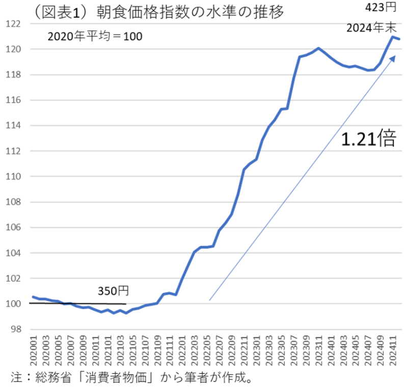 2022年に筆者が開発した朝食価格指数を、最近までデータ更新してみた。すると、その伸び率は最近になると頭打ちになってはいるが、その価格水準はどうしても下がりにくい(図表)。わかりやすく示すために、2020年平均の朝食価格が350円(ベンチマーク)だったと仮定して、2024年末にはどのくらいになったのかを計算してみた。すると、その価格変化は1.21倍、つまり350円が423円に高騰していた。その値上がりは、生活者にとって痛いものだと認識できる。