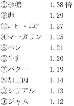 朝食価格指数をコンポーネント別に調べると、同じ期間の伸び率で高い順に並べて次の通りになっていた。