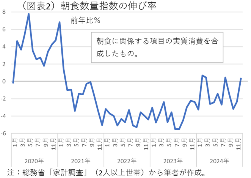 また、これは実質賃金の推移とも符号する動きである。つまり、家計の余裕がなくなると、朝食の内容も寂しくなり、徐々に余裕が回復してくると、朝食の見直しも行われる。2025年は賃上げがしっかりとしていき、朝食内容が再び充実される方向に変わっていくことを期待したい。
