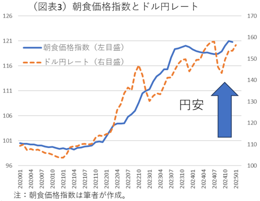 要因には、世界がインフレになり、穀物などの国際商品市況が高騰していることもある。それ以外に大きいのは円安の影響だろう。2020年以降のチャートをみると、朝食価格指数とドル円レートの推移は、微妙に連動していることがわかる(図表3)。円安になれば、やはり朝食価格指数も上がっていくという関係である。輸入物価が継続的に高騰するなか、為替が円安基調を維持しているために容易に下がらない。もしも、大幅な円高に転じれば、食料品価格はもっと下がっていくと考えられる。