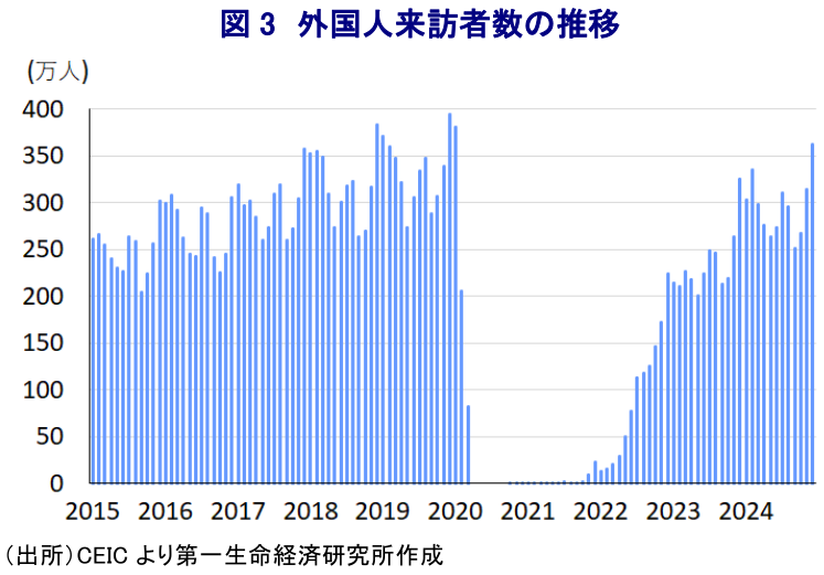 こうした状況は分野ごとの生産動向に現れており、外需を巡る不透明感が高まっていることを反映して製造業の生産は2四半期連続で減少しているほか、鉱業部門の生産も下振れする動きをみせるとともに、建設業の生産も3四半期ぶりの減少に転じるなど、幅広い分野で生産活動に下押し圧力が掛かる動きがみられる。一方、異常気象の頻発などを理由に過去2年ほどは力強さを欠く推移が続いた農林漁業関連の生産は大きく底入れしており、供給懸念が食料インフレを招く一因となってきたことに鑑みれば、先行きについてはそうした懸念は後退することが期待される。また、中国人観光客をはじめとする来訪者数も底入れの動きが続いていることを受け、観光関連産業がGDP比で1割強に上るなかで関連産業をはじめとするサービス業を中心に生産活動は堅調な推移をみせており、サービス輸出の堅調さが景気を下支えしている様子がうかがえる。ただし、サービス業のなかでも家計消費に関連する分野では生産活動が力強さを欠く推移をみせるなど、上述のように政策支援が期待外れの内容に留まっていることが景気の足かせとなる懸念はくすぶる。
