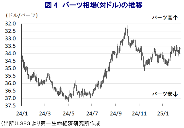 なお、中銀は昨年10月にコロナ禍後初の利下げに動くも、その後は米トランプ政権の通商政策を巡って外需に不確実性が高まっていることを理由に、金利を据え置くなど『タカ派』姿勢を堅持する考えをみせている(注2)。こうしたなか、今年9月末に任期満了を迎える中銀のセタプット総裁の後任人事を巡って前進する動きが確認されており(注3)、政府が中銀に対して利下げを要求してきたことに鑑みれば、今後もそうした姿勢を陰に陽に強めることが予想される。他方、中銀が慎重姿勢を崩さない背景には、ペートンタン政権が財政出動を通じた景気下支えに注力する姿勢を強めるなかで財政運営に対する懸念のほか、バーツ安を引き起こすなどインフレ圧力が高まることを警戒していることがある。足下のバーツ相場を巡っては、国際金融市場における米ドル高圧力が高まっているにも拘らず、中銀による慎重姿勢が下支え役となるなど、周辺国通貨と比較しても落ち着いた推移をいせている。しかし、仮に政府の意向が政策運営に反映されやすい環境となれば、一転してバーツ相場を取り巻く状況が厳しさを増す事態も予想される。その意味では、当面は中銀総裁人事を巡る動きの行方に注目が集まることは避けられないであろう。