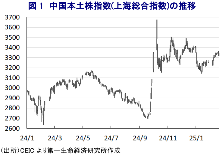 こうした状況を勘案すれば、民間ビジネス、とりわけテック企業を巡っては、これまで以上に事業展開に向けた障壁が取り払われる可能性は高まっていると捉えられる一方、これらの企業は中国以外の国々においては党・政府の『代弁者』としてビジネスを展開していく懸念は極めて高い。よって、いわゆる「トランプ2.0」の下で米中摩擦が新たな段階に突入するなかでは、これらの企業が対立の矢面に立たされるとともに、外国人投資家にとってこれらの企業との付き合い方に様々な形で『注文』が付くリスクにも注意を払う必要性は高い。その意味では、市場は同シンポジウムの開催を以って信頼感を取り戻すと期待する向きをみせているが、その内実をこれまで以上に注視する必要性は高まっている。