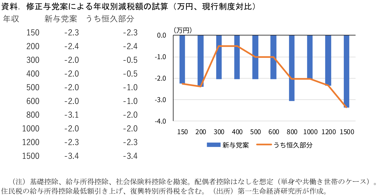 今回の修正案の場合、中間層への時限措置も含めた年収別減税額は資料のようになる。時限措置分も含めると多くの年収層で2万円程度/年の減税になるイメージだ。“高年収者ほど減税額が大きくなる”ということを避け、減税額を均一とすることに重きが置かれた内容といえる。
