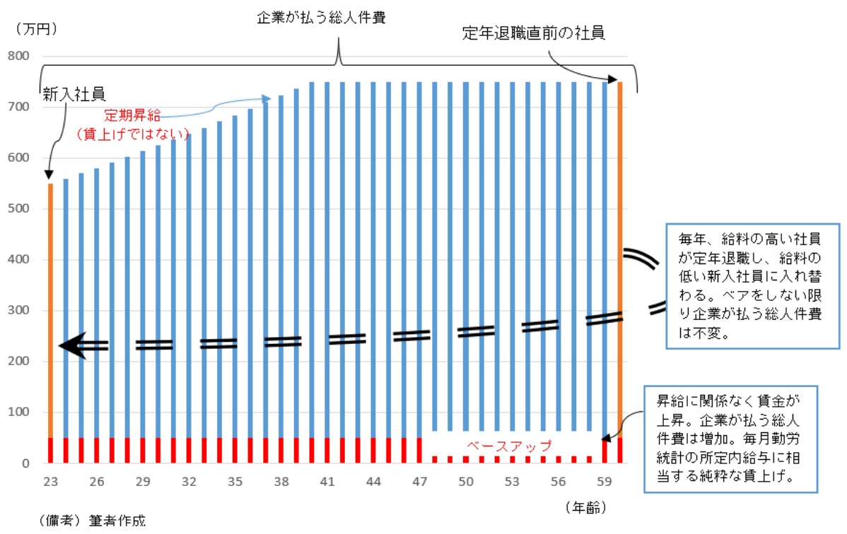ベアと定期昇給を整理するための概念図を作成した。最も重要な点は、企業が払う総人件費が増えるか否かである。その点、定期昇給は労働者一人一人にとって賃金の増加となるが、会社全体でみた場合は(小学校内の平均年齢が毎年一定であるのと同じように)毎年、給料の高い社員が定年退職し、給料の低い新入社員に入れ替わるため、総人件費は不変となる。もちろん、社員が全体として高齢化すれば、それぞれの昇給に応じて総人件費が増加する事例もあるが、飽くまで、それは予め定められていた制度内における賃金上昇であり、昇給がなかった労働者の賃金は上がらない。総人件費に影響を与えない定期昇給は、マクロでみれば賃上げを意味しない。