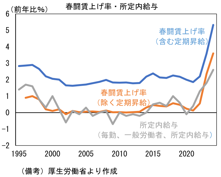 上記で示した5.3%、3.5%という数値がそれぞれ何を意味しているのか確認したい。結論を先取りすると、重視すべきはベースアップに相当する3.5%である。一方、ヘッドラインとして取り扱われることの多い、定期昇給を含んだ5.3%という数値は、マクロ的なインフレ圧力を計測する上であまり意味がない。ヘッドラインの数値は、賃金上昇の勢いを時系列で比較する際の目安程度に位置付けておくべきであろう。