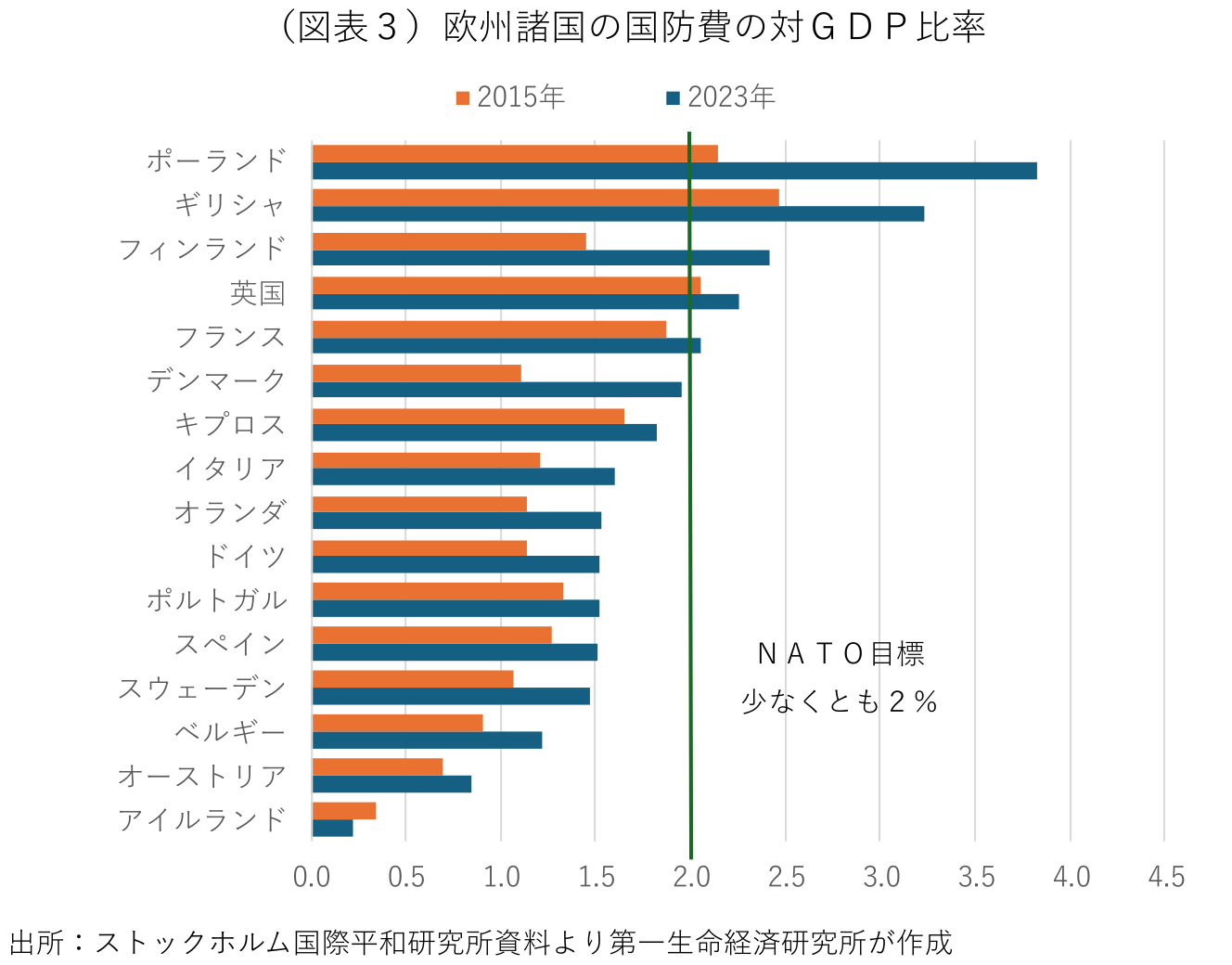 国防費の増額を可能にする取り組みは、EUレベルでも検討が進められている。欧州委員会のフォンデアライエン委員長は4日、6日に開催されるウクライナ和平と安全保障環境を話し合う欧州首脳会議の場で、総額8000億ユーロ規模の欧州の防衛力強化に向けた新たな計画を提案する意向を示唆した。これらはGDP比で1.5%程度の国防費の増加に相当する(図表3)。このうち1500億ユーロは国防費に関連した投資に充てることを目的にEUが加盟国に資金を提供し、残りの6500億ユーロはEUの財政規律の適用除外規定を活用し、加盟国が財政規律に抵触することなく、向こう4年間の国防費を増額することを可能にする。1500億ユーロが新規の債券発行やEU予算から賄われるのか、欧州復興基金の未利用枠やEUの構造結束基金の資金使途見直しなどを通じて賄われるのかなど、現時点で詳細は不明だ。国毎の適用除外規定は、加盟国の制御不可能な特別な状況が中期的な財政の持続可能性を脅かさない場合に認められる。現下の安全保障環境やウクライナ情勢を考えれば、国防費の増額は不可避で、ドイツ・EUともに財政拡張に舵を切る。
