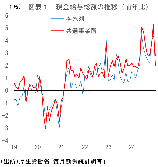 名目賃金は、ボーナスの支給時期である6、7、12月に特別給与の影響を大きく受けるが、その他の月については所定内給与の動きに概ね連動する。25年1~4月はボーナスの影響を受けにくいことから、所定内給与の足元のトレンドである前年比+3%前後で推移することが予想される。なお、25年5月以降は、25年春闘の結果次第だ。