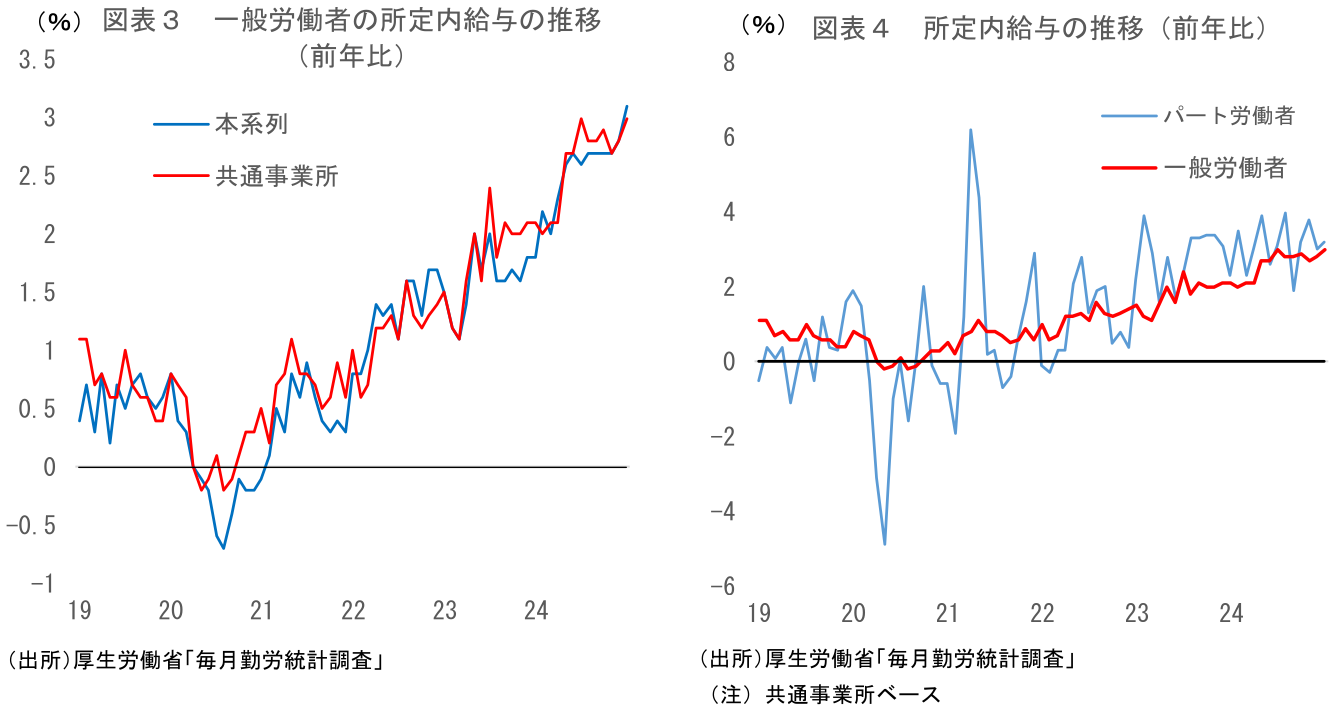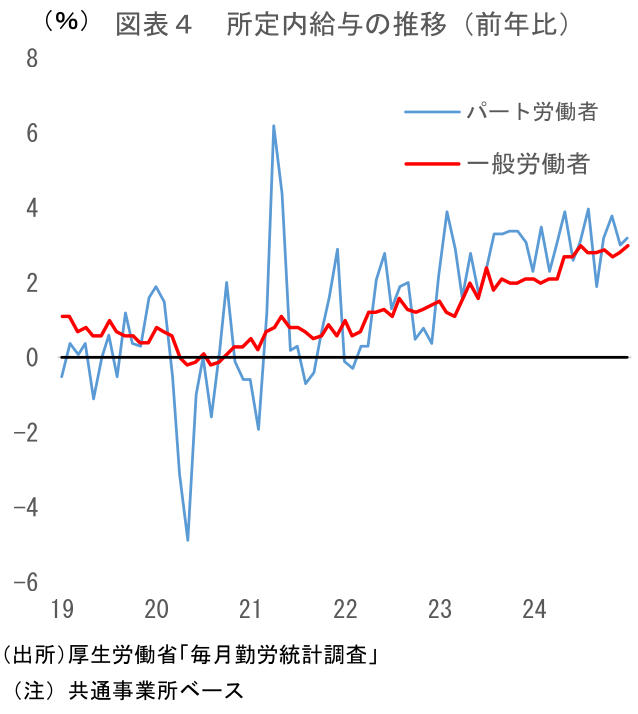 ボーナスによる攪乱があった一方、所定内給与は前月から大きな変化はなかった。春闘賃上げの影響を大きく受ける一般労働者の所定内給与(共通事業所ベース)は前年比+3.0%と、12月の同+2.8%から上昇率を若干高めた。春闘結果の反映が始まった24年5月以降、概ね+3%弱程度の伸びが続いている。なお、24年春闘で決まった賃上げの反映については概ね終わっていることから、先行きここから一段の上振れは考えにくく、一般労働者の所定内給与は当面前年比+3%程度で推移することが見込まれる。パート労働者の賃金については人手不足の影響によりさらに伸びる可能性があるが、全体を大きく押し上げるほどにはならない。パート、一般を含めた所定内給与全体でみても大きくは変わらないだろう(図表3、4)。