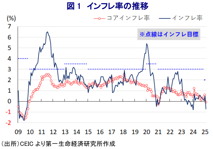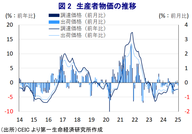 このところの中国経済を巡っては、コロナ禍をきっかけにした不動産不況の深刻化が幅広い経済活動の足かせとなる展開が続いている上、若年層を中心とする雇用回復の遅れも重なり、個人消費をはじめとする内需は力強さを欠く推移をみせている。さらに、米トランプ政権は中国からのすべての輸入品に追加関税を課す動きをみせており、ここ数年の米中摩擦や世界的なサプライチェーン見直しの動きも重なる形で外需を巡る環境も厳しさを増している。こうしたなか、中国当局は昨年半ば以降、不動産市況の下支えに向けて取り組みを強化するとともに、個人消費を支援すべく耐久消費財の買い替え促進に向けた補助金政策(以旧換新)に加え、企業部門には大規模設備更新を促すなど、幅広く内需喚起を図る動きをみせている。そして、これらの取り組みを後押しすべく金融緩和と財政出動を通じた総合的な政策支援に取り組む方針を示すとともに、今年の経済政策の運営方針も『より積極的な』財政政策と『適度に緩和的な』金融政策に動く方針を示すなど、内需喚起に傾注する姿勢を示してきた。よって、昨年末にかけての景気は一連の内需喚起策を受けて個人消費が下支えされたことに加え、米トランプ政権の発足を前にした輸出の駆け込みの動きも重なり底入れしたため、昨年通年の経済成長率も+5.0%と昨春の全人代(第14期全国人民代表大会第2回全体会議)で掲げた政府目標(5%前後)をクリアした(注1)。 そして、今月5日に開幕した全人代(第14期全国人民代表大会第3回全体会議)においても今年の経済成長率目標を「5%前後」と昨年の目標を据え置くとともに、その実現に向けて内需を一段と喚起させるべく財政出動を積極化させる方針を示している(注2)。また、不動産市場の安定に向けた努力を払うとともに、潜在的な需要創出に向けた取り組みを強化させるほか、その背後にある地方政府の債務問題についてもリスク抑制を図るとともに、バランスよく削減に向けた取り組みを強化するといった考えを示している。とはいえ、不動産市場の安定化や地方政府債務を巡る問題については方向性こそ示すも具体性に乏しい内容に留まるほか、金融分野を巡るリスクについても同様の姿勢が示されていることに鑑みれば、事実上の『棚上げ』状態が続く可能性に引き続き注意を払う必要がある。 このように中国経済を巡る不透明感がくすぶるなか、不動産市況の低迷という資産デフレ圧力に加え、雇用回復の遅れが個人消費の重石となる形でディスインフレ圧力が強まる展開が続いているが、今年は春節(旧正月)の時期が前年から大きく前倒しされたことも影響して1月のインフレ率は伸びが加速する動きがみられた(注3)。しかし、こうした事情に鑑みれば2月は再び下振れすることが予想されたなか、2月のインフレ率は前年同月比▲0.7%と13ヶ月ぶりのマイナスとなるなど頭打ちする動きが確認されている(図1)。前月比も▲0.2%と3ヶ月ぶりの下落に転じており、春節連休の終了を受けて豚肉(同▲1.9%)や卵(同▲5.5%)、野菜(同▲3.8%)といった生鮮食料品のほか、このところの国際原油価格の頭打ちの動きを反映してエネルギー価格も下落しており、生活必需品を中心にインフレ圧力が後退していることが影響している。しかし、食料品とエネルギーを除いたコアインフレ率も前年同月比▲0.1%と4年強ぶりのマイナスに転じており、インフレ率とともに政府目標(2%前後)を大きく下回る伸びに留まっている。前月比も▲0.2%と3ヶ月ぶりの下落に転じており、家計部門の消費意欲の乏しさが幅広く財価格の重石となるとともに、サービス物価も幅広く下振れする動きが確認されるなど、雇用回復の遅れが物価の重石となっている様子もうかがえる。