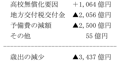 また、日本維新の会の高校無償化の主張を受け入れたことで、一般歳出は1,064億円ほど増加している。無償化の要件にあった所得制限を撤廃したことによる給付対象の拡大のためである。その代わりに予備費1兆円を▲2,500億円ほど減額することで、歳出規模の増加を圧縮した。