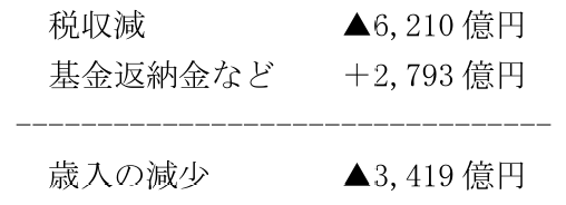 しかし、減収分の3分の1は地方交付税交付金が自動的に減額(▲2,056億円)になる。地方財政へのダメージは免れられなかった。その一方で、国の予算上はネットで▲4,154億円の悪化に止まっている。
