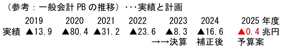 2025年度予算案(修正後)における財政赤字は、28.6兆円(286,471億円)である。ここから国債費(282,179億円)を差し引くと▲4,292億円になる。これが基礎的財政収支赤字(PB赤字)の金額になる。前年の補正後予算の赤字額が▲16.6兆円だったから、2025年度には大幅な赤字改善になる予算案だ。政府が掲げてきた2025年度におけるPB黒字化が目前にあることは、石破首相の手柄と言ってよい。