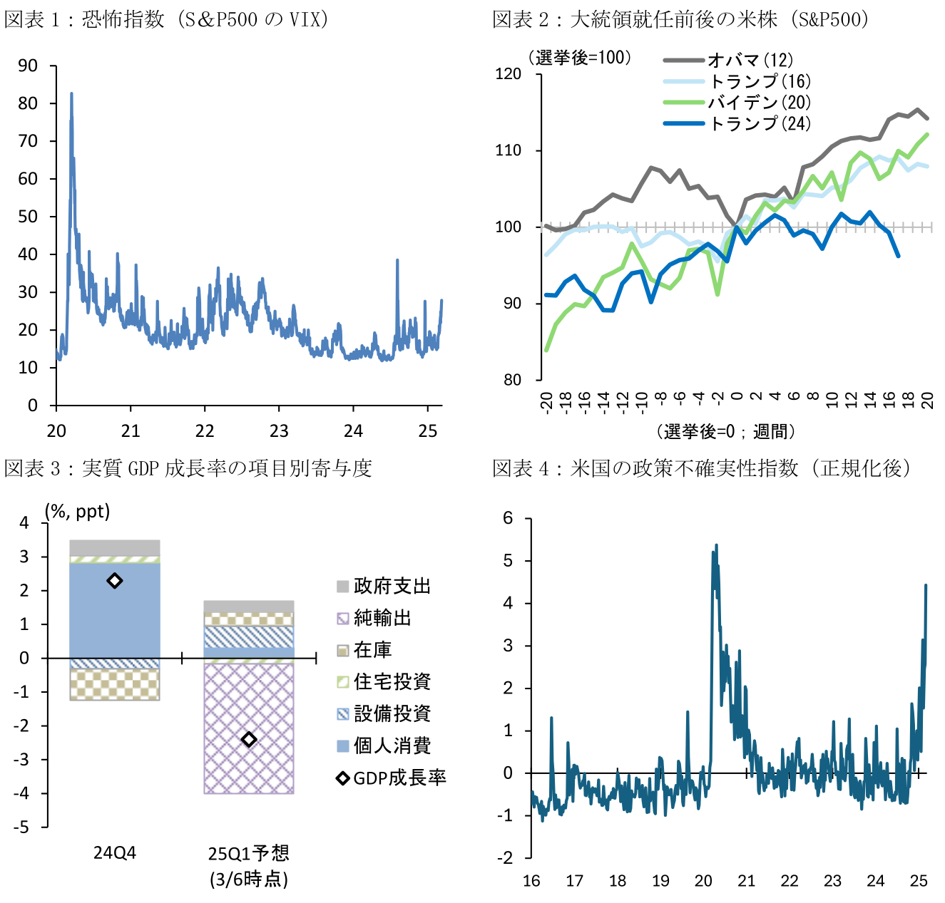 金融市場の不安定な動きが続いている。3月10日、米国のS&P500は前日比-2.7%下落したほか、恐怖指数であるVIX(ボラティリティ指数)は27.9と、米国の景気後退懸念が急浮上した2024年8月5日以来の水準に到達した。