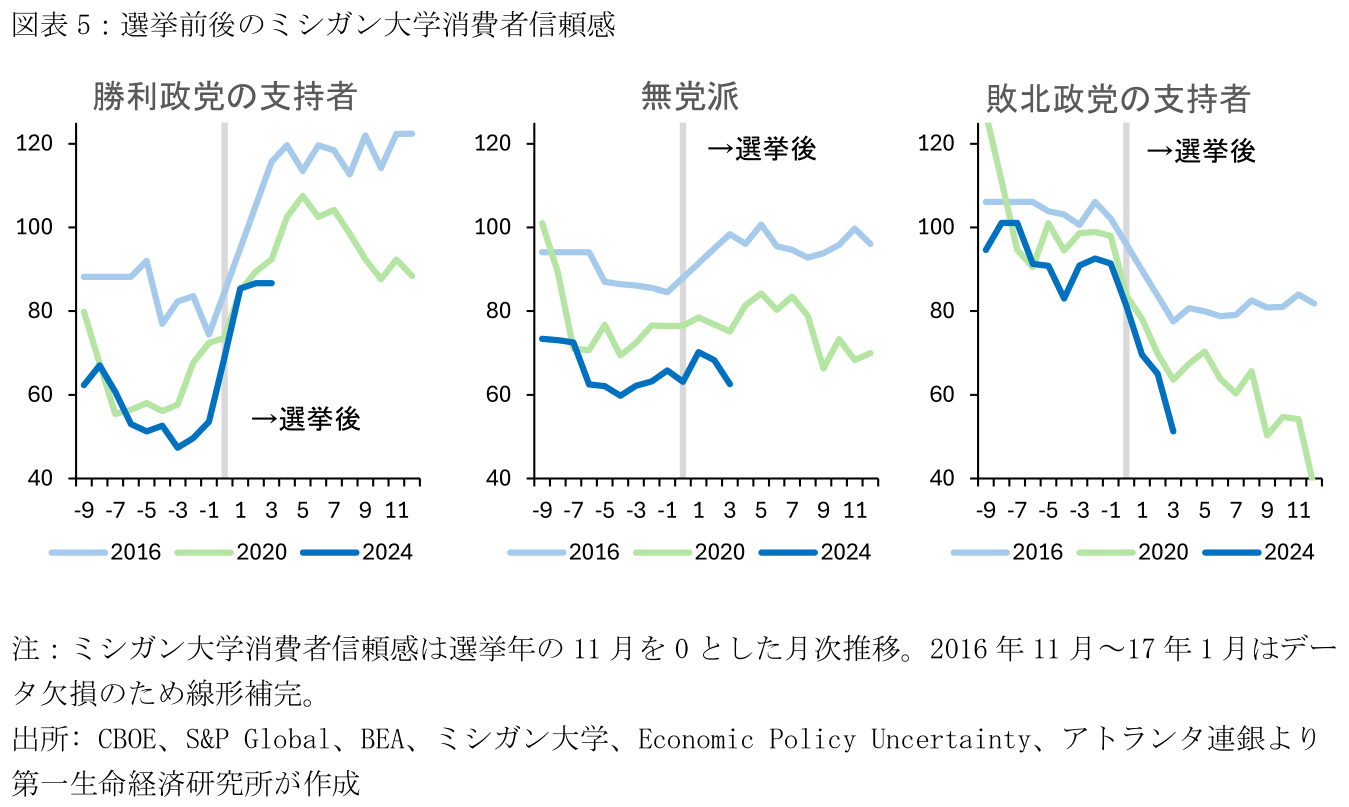 現時点の経済指標を踏まえる限り、筆者は米国経済の景気後退リスクは高くないと考えている。とはいえ、少なくとも今後数か月は通商政策や財政政策を巡る不透明感が続く可能性が高い。なお、現時点のトランプ政権ではMAGA(米国第一主義)派の影響力が比較的強いとみられる一方、軟調な株価や経済指標が続き、共和党支持者の間でも政策への不満が強まる場合、ベッセント財務長官など経済を重視する穏健派の発言力が強まる展開も予想される。例えば、足下のミシガン消費者信頼感をみると、共和党支持者のマインドは選挙後からほぼ変化がないものの、3月4日以降の追加関税発動が輸入物価上昇とインフレ加速を通じてこうしたトレンド変化させるのかが注目される。