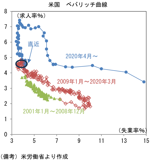 平均時給の先行指標として注目される自発的離職率は2.05%へと上昇し、下げ止まった。転職活動の活発度合いを示すこの指標は、賃金上昇圧力を計測する上で重視されており、実際、平均時給と一定の連動性を有する。過去数ヶ月における自発的離職率の下げ止まりは、賃金インフレが適正な水準に落ち着くことを示唆しており、その点において安心感がある。
