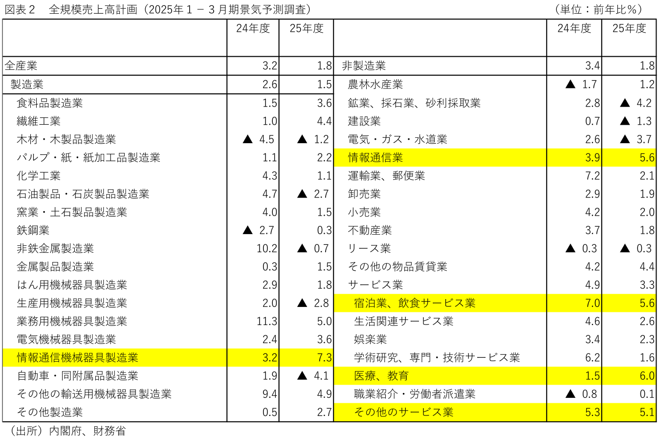 以下では、4月下旬からの決算で、来季売上高計画で高い増収率が期待される業種を見通してみたい。(図表2)は業種別売上高計画(全規模)を24年度と25年度の前年比で比較したものである。