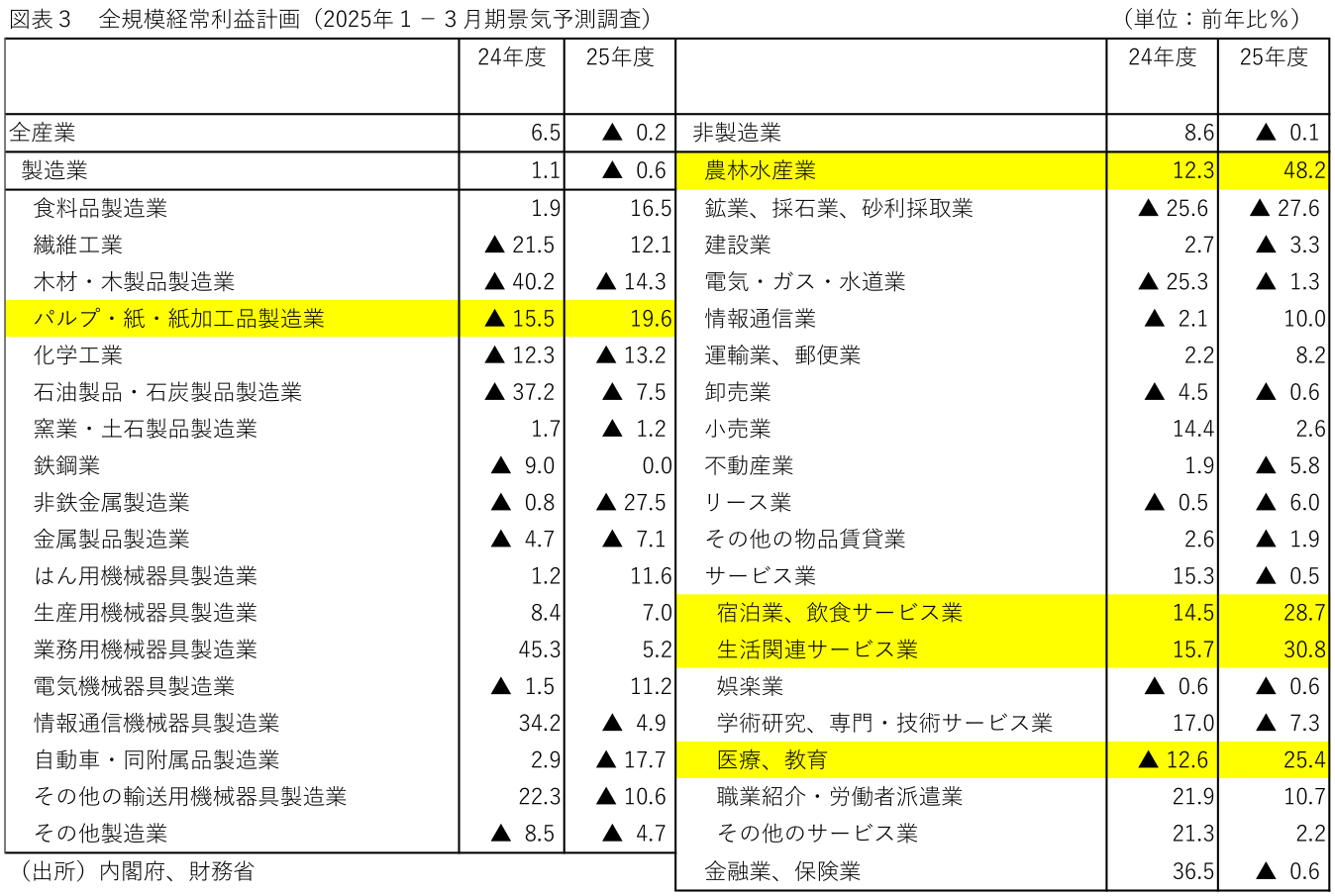 - 25年度に大幅増益が計画されている業種は「農林水産」「生活関連サービス」「宿泊・飲食サービス」「医療・教育」「パルプ・紙・紙加工品」の順となる。「農林水産」については農産品の輸出が好調なことに加え、諸々の供給不足などにより価格転嫁が進んでいることが推察される。「生活関連・宿泊・飲食サービス」は、いずれもインバウンド消費の拡大に加えて、大阪関西万博等に伴う需要増を期待している可能性。「医療・教育」は堅調な需要を受けて強気な計画、「パルプ・紙・紙加工品」については石炭等の価格が低下していることに伴うコスト減効果が大きいことが推察される。
