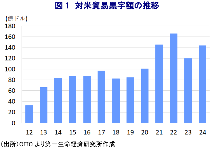 ここ数年のアジア新興国においては、米中摩擦が激化する背後で進んだサプライチェーンの見直しの動きを追い風に対内直接投資の受け入れを拡大させるとともに、対米輸出が押し上げられるなど『漁夫の利』を得る動きがみられた。他方、多くのアジア新興国は近年の中国の経済成長を追い風に中国経済への依存を強めてきたが、中国景気の不透明感が高まるなかで中国向け輸出が頭打ちする一方、米国向け輸出の拡大が外需を下支えしてきた。インドネシアにおいても、バイデン前政権下の米国向け輸出が拡大してきたことで対米貿易黒字幅は拡大させる動きが確認されている。なお、インドネシアは米国にとっての貿易赤字国として15番目に留まるものの、昨年同国の対米貿易黒字額はトランプ1次政権最後の年の2020年に比べて1.4倍となっており(図1)、トランプ政権の通商政策の『矛先』が向かうリスクがある。この背景には、トランプ氏が相互関税の賦課に言及するなか、同国の平均関税率がアジア新興国の間でも比較的高く、米国からの輸入の阻害要因となっていると見做される可能性も影響している。