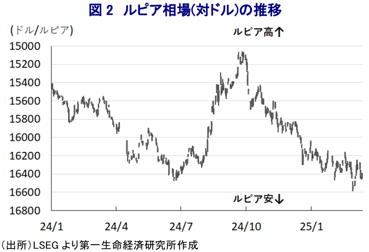 こうした状況も影響して、上述のように金融市場では米トランプ政権の通商政策に対する不透明感が足かせとなる形でインドネシアの通貨ルピアの対ドル相場に対する調整圧力が強まる動きがみられるとともに、今月初めにはコロナ禍直後以来となる安値を更新する事態に見舞われた(注1)。その後は金融市場において米国の長期金利が頭打ちしていることを受けて、米ドル指数は頭打ちする動きをみせているものの、ルピアの対ドル相場については上値の重い展開が続くなど昨年後半以降の調整局面を脱する状況とはなっておらず、大きく状況は変化していない(図2)。なお、足下のインフレはプラボウォ政権が1月と2月の時限措置として電力料金の割引措置を実施した影響で下振れしているものの、コアインフレ率は緩やかに加速する動きが確認されており、このところのルピア安が輸入物価を押し上げるなど幅広くインフレ圧力を増幅させる一因となっている様子がうかがえる。