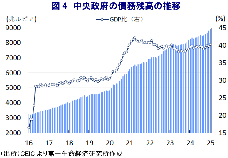 こうしたなか、プラボウォ氏は1月末に財政懸念の払しょくに向けて各省庁に対して歳出見直しに着手するよう指示し、最終的に当初予算(3,613兆ルピア)の約1割に当たる306兆ルピア相当を削減する方針を示した。ただし、プラボウォ氏が選挙公約に掲げた学校給食の無償化をはじめとする貧困層や低所得者層に受けの良い政策が重点化される一方、インフラ整備をはじめとする公共投資に関連する歳出は軒並み削減の対象とされている模様である。結果、歳出削減の影響を受ける形で道路の整備・維持管理といった事業が滞るとともに、新規建設計画の延期のほか、ジョコ前政権の肝煎りである新首都(ヌサンタラ)建設関連事業でも遅延が生じるなど、幅広く悪影響が出る動きが顕在化している。さらに、公務員給与の遅配が懸念されるとともに、非正規雇用者を中心に解雇に追い込まれる動きが出るなど、雇用環境に悪影響が出る可能性も高まっている。そして、歳出削減に伴う政府の出張や式典の削減の余波を受ける形でホテル事業者の団体は売り上げが大幅に減少するとの声明を発表しており、政府消費に依存した分野を中心に売り上げ減のほか、そうした事態を受けて雇用調整圧力が強まるなど副次的な悪影響が広がる懸念が強まっている。プラボウォ氏が歳出削減に動いた背景には、同国ではアジア通貨危機をきっかけに財政赤字をGDP比▲3%を上限とする財政規律を重視した財政運営が採られており、そうした動きに倣ったと捉えられる。同国ではコロナ禍を経て中央政府の債務残高の水準は大きく切り上がったものの(図4)、GDP比で4割程度と周辺国と比べて依然低水準に留まる。よって、財政運営についてはメリハリが重要になっていると捉えられる。