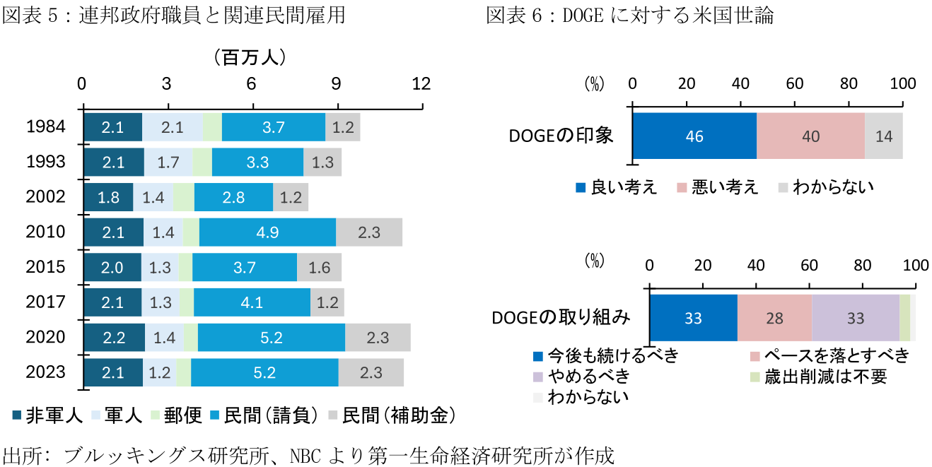 こうした政府職員削減を含むDOGEの活動を巡って、無駄を削減するという方向性を支持する米国民は多い。NBC Newsが3月7~11日に実施した世論調査によると、「DOGEは良い考え」の回答が46%と、「悪い考え」の40%を上回っている(図表6)。とはいえ、その進め方には懸念の声もあり、DOGEの取り組みを「まだやるべきことがあるので、続けるべき」との回答は33%に留まり、「必要であるが、影響を評価するためにペースを落とすべき」との意見が28%に達する(「無謀であり、これ以上の被害が出る前に止めるべき」が33%)。なお、連邦政府職員に好感を持つ人の割合は49%と、好感を持たない人の21%を大幅に上回る。