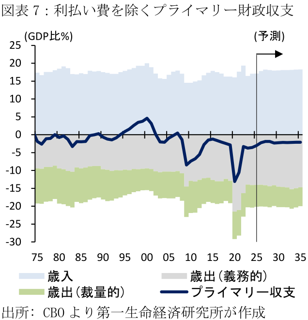 米国の財政収支(利払い費を除くプライマリーバランス)はコロナ禍の2020年度にGDP比で13.1%まで悪化し、直近2024年度では3.6%と依然コロナ以前の赤字水準を上回るなど(2019年度:2.9%)、財政収支の改善ペースは緩慢に留まっている。こうしたなか、DOGEによる急進的なやり方が維持されるかは不透明である一方、政府職員の削減を中心とした財政赤字削減への取り組みは中期的に維持される可能性がある。