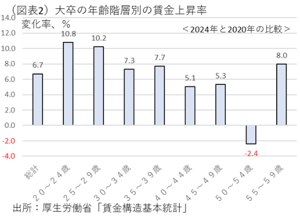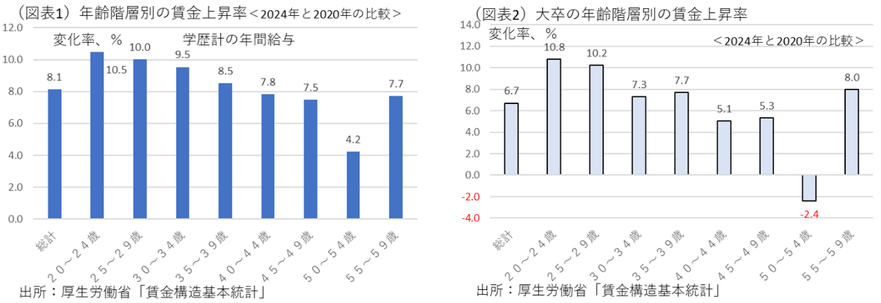 衝撃的なのは、年齢別に名目賃金格差が大きいことである(図表1、2)。学歴計の平均値とは別に、大卒のカテゴリーも調べてみた。大卒・総計と5歳ごとの年齢階級別にみた名目賃金の変化率(2024年÷2020年)は、20~24歳は10.8%、25~29歳は10.2%と大きく伸びていた。50~54歳は▲2.4%と減少していた。これを実質賃金ベースに引き直すと、50~54歳は▲12.4%も購買力が下がっていることになる。かつて、政府、野党、経済界からは「分厚い中間層をつくる」というスローガンが語られたことがある。しかし、現実には所得水準が高い年齢層ほど実質賃金が下がるという悲劇的なことが起きている。賃上げを巡っては、「中小企業はなかなか賃上げができていない」などという話題が専らであり、中高年層の賃上げができていないという点を強調する識者はあまり居ない気がする。もしも、「分厚い中間層の復活」という政策目標がまだ生きているのならば、40~50歳代、そして60歳代以降にも賃上げの恩恵を広げていく発想が不可欠なのではあるまいか。