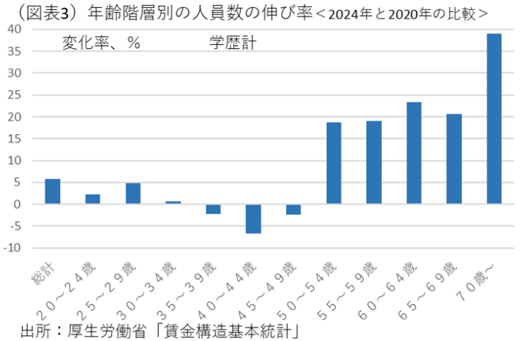 では、なぜ、50歳代やシニアの給与は上がりにくいのだろうか。労働需給がタイトであれば、非正規でも賃上げは進んでいる。この世代は、元々、バブル期採用や団塊ジュニア世代で人数が多く、労働需給が緩和的である。20・30歳代は、人口減少で人数が多くはなく、かつ相対的に需給が逼迫している。つまり、若手人材が不足していて、50歳代・シニアは余っているのだ。これは、2024年の人員数と2020年の人員数を比べたとき。50~54歳以降の年齢層が大幅に増加していることからもわかる(図表3)。