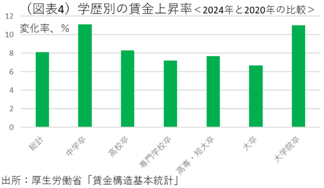 それに比べると、新戦力として重視されるのは、20・30歳代の若手である。彼らは、従来は相対的に賃金水準が低かった。そこで、ここ数年は初任給の見直しがさかんに行われている。大学院卒の20・30歳代の賃金の上昇率は、2020年から2024年にかけて13~16%と著しく高くなっている。より高学歴の若手は引く手あまたなのである。企業が欲しているのは、単なる労働力ではなく、これから戦力化していく若手人材である。