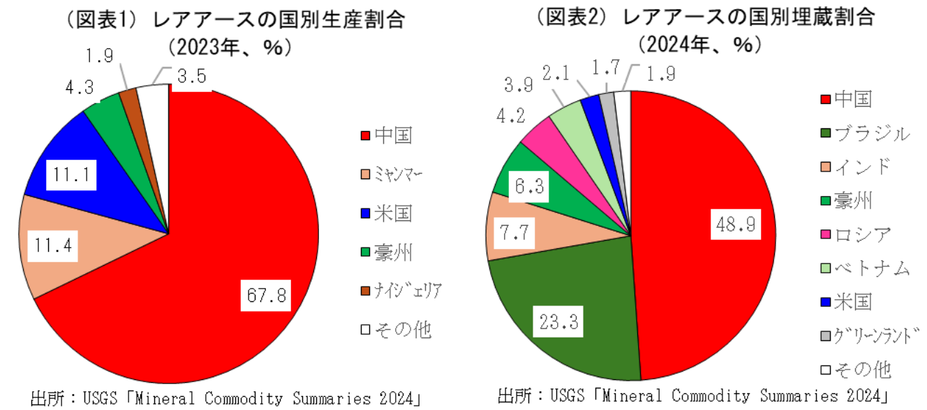 2023年のレアアースの生産量を国別に見ると、中国のシェアが67.8%と圧倒的となっている(図表1)。また、埋蔵量で見ても中国のシェアは48.9%と世界全体の半分程度を占めている(図表2)。