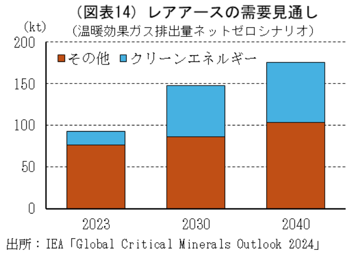 IEA(International Energy Agency:国際エネルギー機関)の試算によれば、2040年までのレアアース需要は、クリーンエネルギー以外の用途は+36.0%(2023年比)となる一方で、クリーンエネルギー用途分は+340.5%(同)と4.4倍に達するとされている(温室効果ガス排出量ネットゼロを達成する場合)(図表14)。