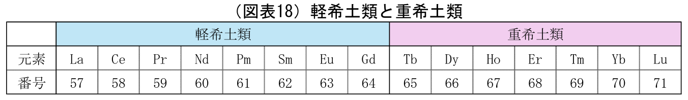 レアアースは、化学的物質が類似していることから、軽希土類と重希土類という二つのグループに分類される(図表18:軽希土・中希土・重希土の3グループに分ける場合もある)。