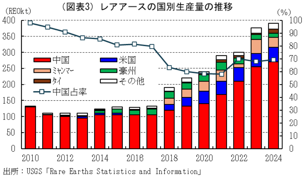 レアアースは先端技術の発達とともに需要が拡大している。とくに、EVや風力発電機のモーターなど、温室効果ガス削減の切り札としてレアアースは欠かせない資源となっている(【補論2】ご参照)。一方で、レアアースは産出国の偏りが大きなリスク要因となっている。
