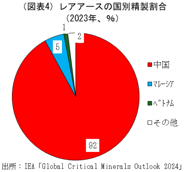 もっとも、レアアースの供給リスクは生産量の側面にとどまらない。世界のレアアースの精製シェアは中国が92%と、世界を独占した状態にある(図表4)。すなわち、現状では米国を含め各国がレアアースの採掘を拡大させても、最終的には中国の精製に頼らざるを得ない、供給リスクが極めて高い状態から脱却できる目処が立っていない(【補論5】ご参照)。