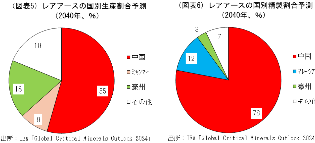 なお、IEAは15年後となる2040年におけるレアアースの国別生産や精製割合の予測を公表している。これによれば、2040年のレアアースの生産割合は中国が55%と、2023年の67.8%から比率を低下させるものの、引き続き世界全体の50%以上を占めている。また、精製についても2040年の中国のシェアは78%と、2023年の92%からは大幅に低下させるものの、引き続きほぼ独占と言っていい状況が続くと予想している(図表5・6)。