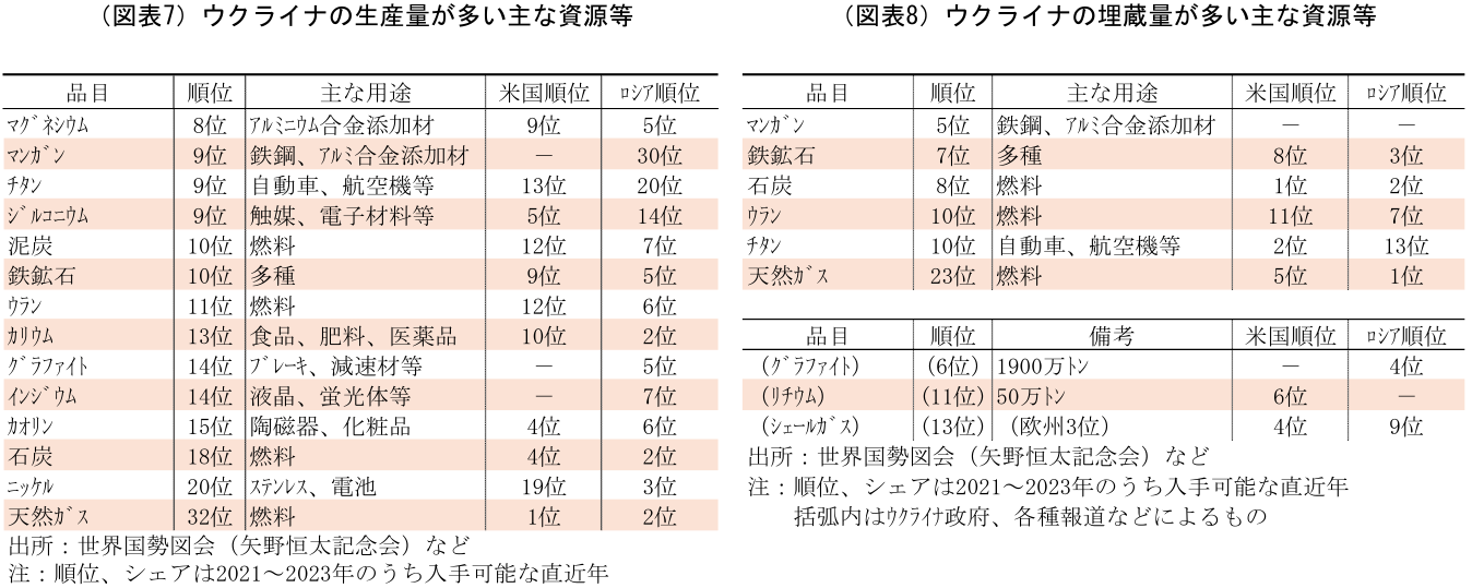 ウクライナは欧州では最も資源を多く保有する国の一つだ(図表7・8・9)。ただし“世界で”となると話は別で、世界の中で圧倒的なシェアを誇る資源があるわけではない。したがって、ウクライナ以上に多くの資源を産出しているロシアや米国から見れば、自国にはない魅力の高い資源はごく一部で、自国の資源を補完するものも限られてくる。