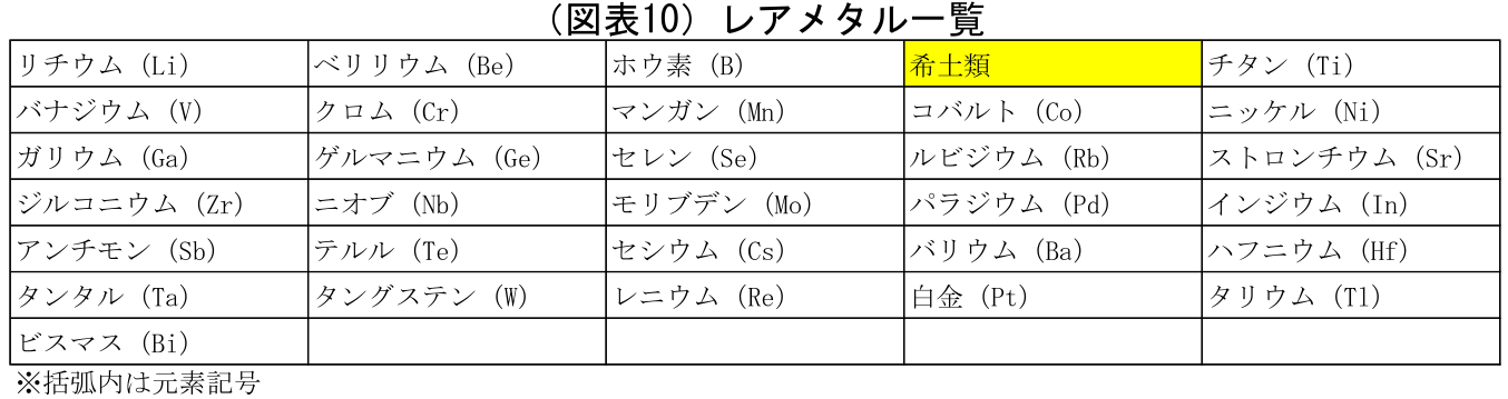 そもそもレアメタル(minor metal)とは、希少な非鉄金属のことを指し、一般的には(図表10)の31鉱種を指す。対語となるのがベースメタルと呼ばれ、鉄や銅、亜鉛、アルミニウムなどがこれに当たる。レアメタルはベースメタルに比べて採掘が難しい(高技術が必要、コストがかかるなど)、存在量が少ないといった特徴がある。しかし科学技術の発達につれてレアメタルの需要も拡大し、最先端分野の技術や商品には欠かせない物質となっている。