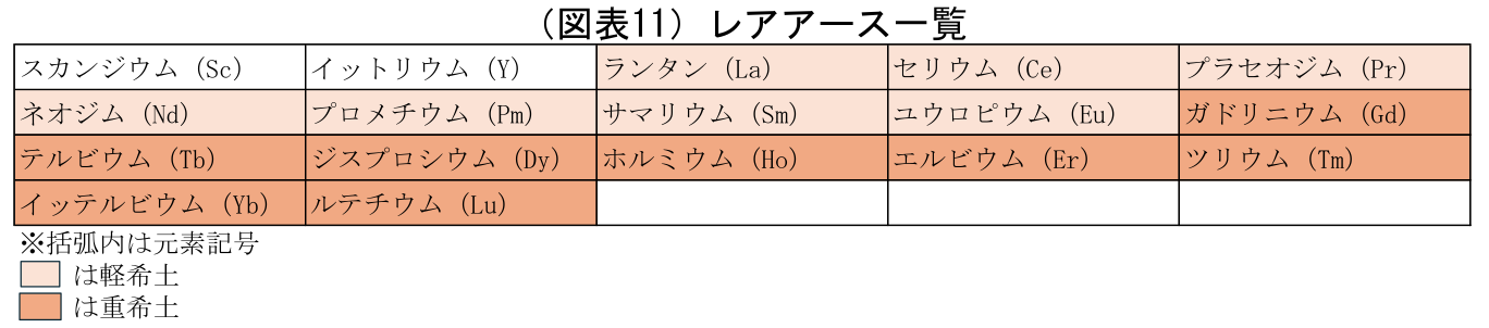 一方、レアアース(rare-earth elements)はレアメタルの中の1鉱種(図表10の希土類)で、15元素のランタノイドとスカンジウム、イットリウムの2元素を合わせた17元素を指す(図表11)。レアアースは単体の鉱石として産出されることはないとされており、一つの鉱石の中に混在している。単体の元素として抽出する際にはトリウムなどの放射性元素の処理が必要になるなど、分離精製するには相応の技術とコストがかかる。世界の生産量は40万トン弱(2024年:39万トン)であるのに対し、埋蔵量は9000万~1億トン程度と、レアアース全体としての資源の枯渇は危惧されていない。