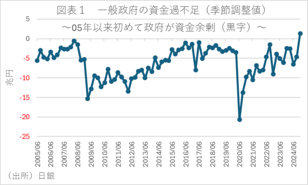 こうした中で、石破政権が家計支援策を検討し始めた背景には、特にロシアのウクライナ振興を起点とした40年ぶりのインフレをきっかけに、政府が税収を民間部門から徴収しすぎているという見方もある。というのも、直近2024年10-12月期の日銀「資金循環統計」によれば、一般政府の資金過不足が季節調整値ベースで統計開始以来初の貯蓄超過、すなわち財政黒字の状況になっている(図表1)。