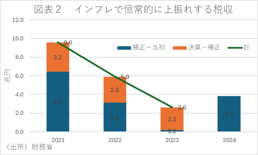 この背景には、コストプッシュとはいえ物価が上がっていることを背景に消費税収や所得税収が増えやすくなっており、結果として国民経済が苦しい割には税収が増えやすくなっているということがある(図表2)。そして何よりも、日本と海外の実質金利差などにより円安の状態にあり、グローバルに展開している大企業等では、海外現地法人の儲けが円換算で膨張することから企業業績が拡大しやすい状況にある。つまり、短期的に家計の負担感が強まる一方で、グローバル企業の法人税収増加や物価上昇に伴う消費・所得税収の増加を通じて、税収の過剰徴収につながりやすいことが背景にある。